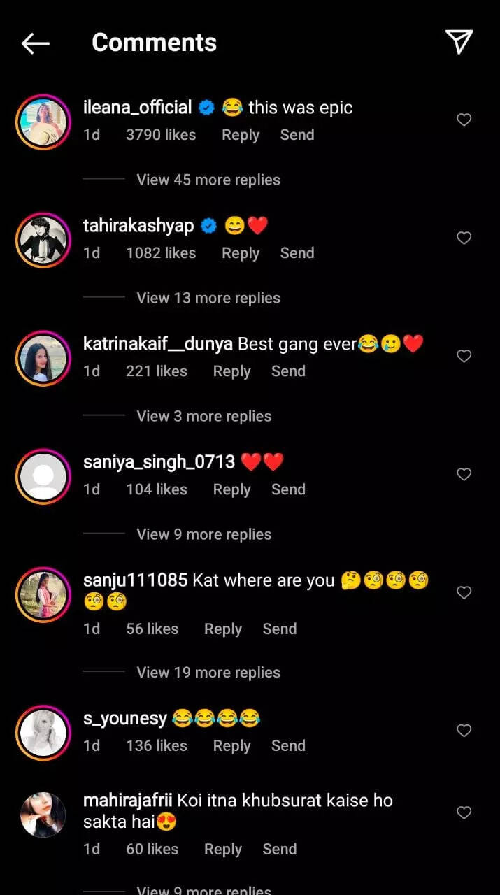 प्रशंसकों और मशहूर हस्तियों ने पोस्ट पर टिप्पणियों और प्रशंसाओं को छोड़ दिया। अभिनेत्री इलियाना डिक्रूज ने लिखा, "यह महाकाव्य था" जबकि आयुष्मान खुराना की पत्नी ताहिरा कश्यप ने स्माइली और दिल के इमोटिकॉन्स गिराए। एक फैन ने लिखा, 'बेस्ट गैंग एवर'। एक अन्य टिप्पणी में लिखा था, "वाह पूर्ण आनंद के क्षण"।